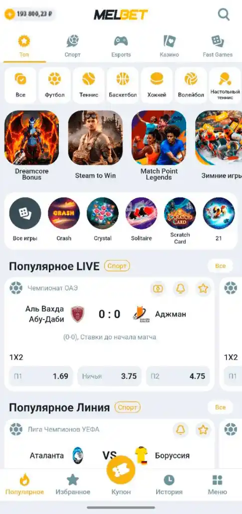 • Быстрые кнопки: линия, live, казино, профиль, платежи.